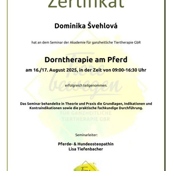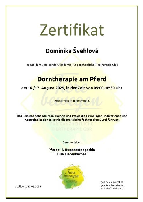 Jsem absolventem kurzu i pracovního semináře Dornovy terapie pro koně a psy, v této metodě se nadále vzdělávám a absolvovala jsem kompletní vzdělání manuálních technik zvířat v Institutu zdraví zvířat. Dovednosti v péči o zvířecí i lidská těla jsem si rozšířila studiem Equine Touch, dále kurzy Osteodynamiky, fasciálních technik, kraniosakrální osteopatie, VHT a tejpování. Všechny tyto citlivé a účinné metody mi neskutečně otevřely oči a odpověděly na mnoho starých otázek ohledně celostní péče a terapie, které jsem marně hledala ve veterinární medicíně.